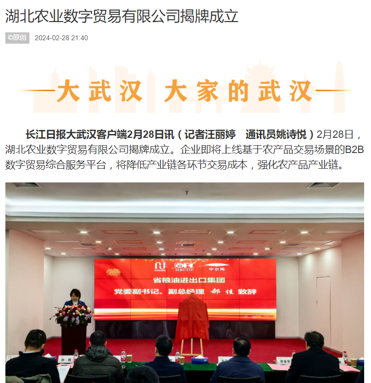 長江日報:湖北農業數字貿易有限公司揭牌成立