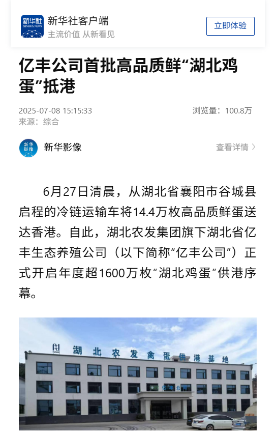 新華社:億豐公司首批高品質(zhì)鮮“湖北雞蛋”抵港